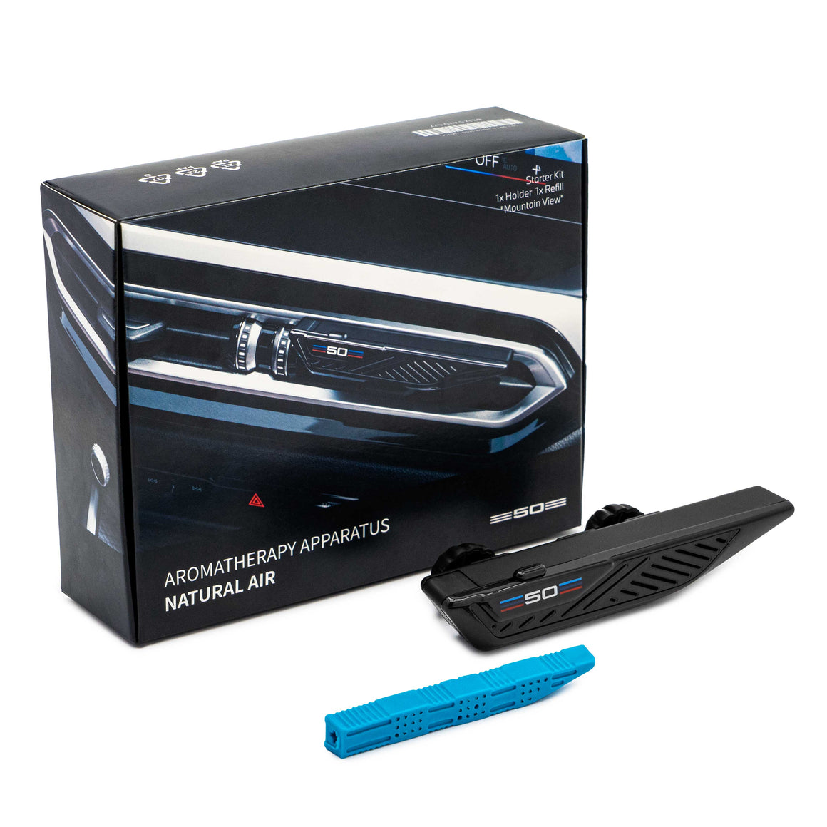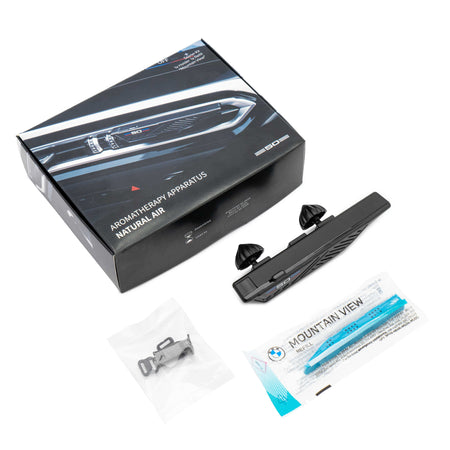 The exclusive Natural Air interior fragrance collection has been specially created for BMW vehicles and includes an adjustable fragrance holder with replaceable fragrance sticks. The collection includes the Relaxing Ocean, Mountain View, Forest Air, Endless Desert fragrances, allowing the car owner to customize the interior fragrance to their taste, creating a comfortable atmosphere during trips. The basic set includes a holder that attaches to the air vents of all BMW models, and an aroma stick with the Mountain View fragrance. The intensity of the fragrance can be adjusted thanks to the air flow and the built-in hole in the holder.