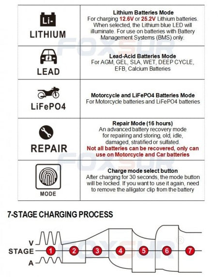 - Battery types: most types of lead acid batteries, including calcium, gel and AGM, wet, EFB, etc.